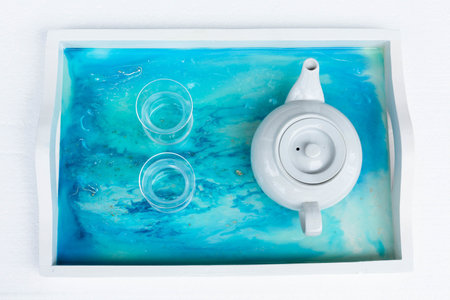 A high angle closeup shot of a teapot and cups on a blue tray with epoxy resin art
