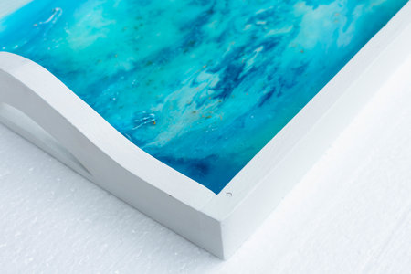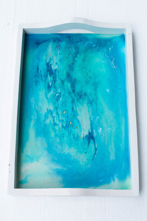 A closeup shot of a white tray with epoxy resin art with blue alcohol inks