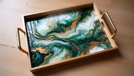 Handmade wood serving tray decorated with marble effect. Epoxy resin art decor. Magazine mock up. Background for DIY master class. Fluid art or acrylic decorative tray. A cup of coffee