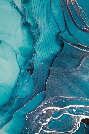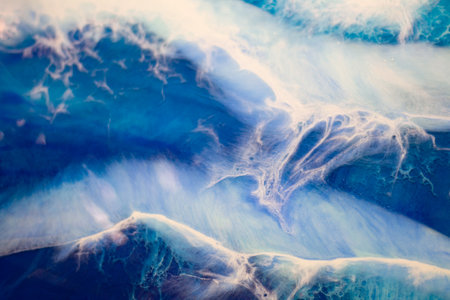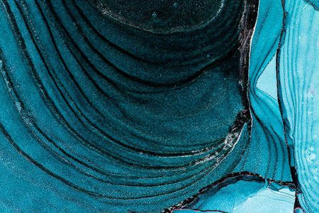 Acrylic ink water. Sea storm. Cyan blue ocean wave splash with white foam effect. Marble texture creative design. Nature art background. Mineral rock abstract pattern with fleck sparkles.