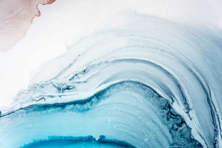 Fluid art background with light blue tints on white stony surface. Liquid ink marble imitation. Marbling effect of acrylic paints on canvas. Abstract marble texture with mixing colors. Modern interior