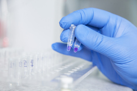 Hand in blue glove holding the tubes with DNA samples after the PCR