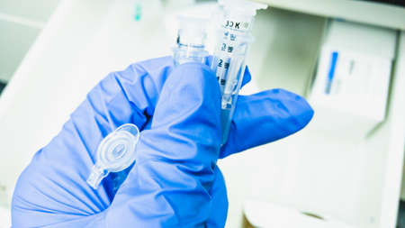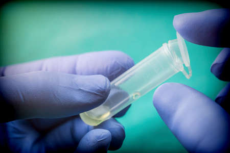 Hand in medical glove gets small test tube