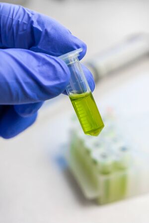 Close up to hands in blue gloves hold microtube with green liquid extract. Synthesis of new vaccine or drug against virus