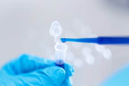 Tube of Taq polymerase for DNA amplification and automatic pipette in hands wearing gloves
