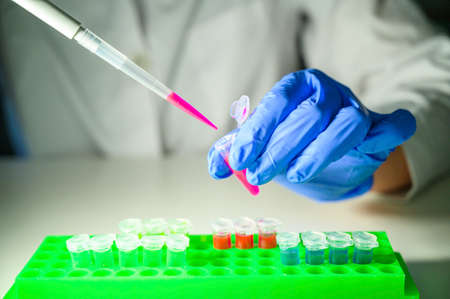 Scientist collects the sample using automatic pipette. Chemical and clinic analysis concept.
