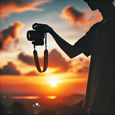 A young man wearing an orange beanie holds a camera, ready to capture a stunning sunset against a rich and colorful background. The scene exudes creativity and passion for photography.