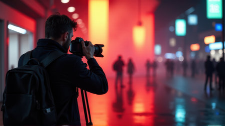 Photographer Taking Pictures at Night in City with Red Lights., generative Ai