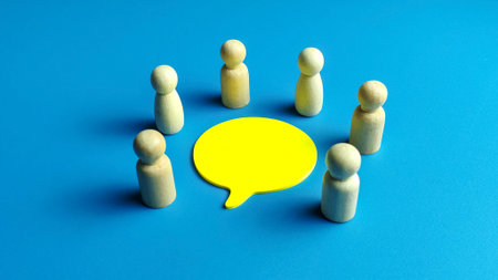Circle of wooden peg people around a yellow speech bubble on blue background for teamwork and discussion
