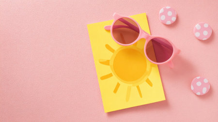 Pink sunglasses and sun design on pink background with polka dot buttons.