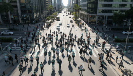 People crossing a bustling city street, digitally enhanced with face recognition and body tracking technology outlines, representing concepts of surveillance, artificial intelligence, and privacy