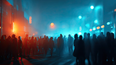 A captivating urban night scene featuring a crowded street filled with silhouettes under vibrant blue and orange lighting, creating an energetic and festive atmosphere.