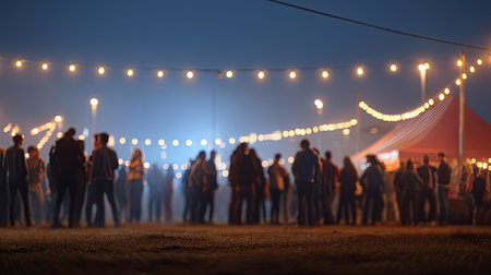 A lively night festival scene featuring a crowd gathered under twinkling lights, with a colorful tent in the background creating a joyful and vibrant atmosphere.