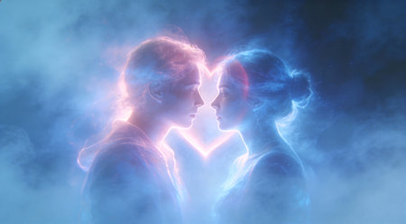 A creative digital illustration depicting Ethereal abstract love auras blending blue and pink mists, expansive foggy composition, diffused bioluminescent glow, atmospheric digital art style, spiritual connection mood, professional stock photo. This AI-generated artwork features unique visual elements suitable for various commercial and editorial applications. AI-generated illustration.