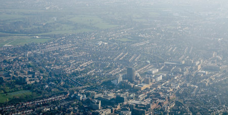 Aerial view of Hounslow in West London on a sunny spring morning. The Blenheim Shopping Centre and Hounslow East tube station are towards the middle with Osterley Park towards the upper image.
