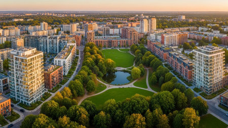 Aerial perspective of a contemporary urban neighborhood featuring apartment buildings surrounding a lush green park...