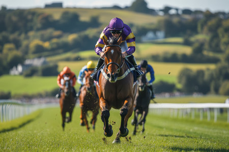 Jockey races towards victory on horse, leading competitors across vibrant grass racetrack