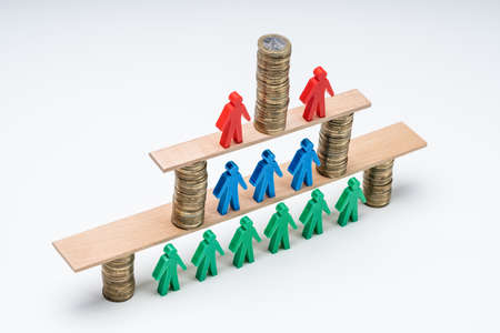 Several dolls representing women and men under the symbol of equal. Concepts of gender equality.