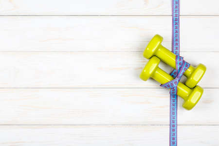 Dumbbells and measure tape lying on white wood background. Concept plan.