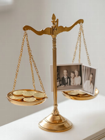 A decorative balance scale shows shiny coins on one side and black and white photos on the other in a sunlit space.