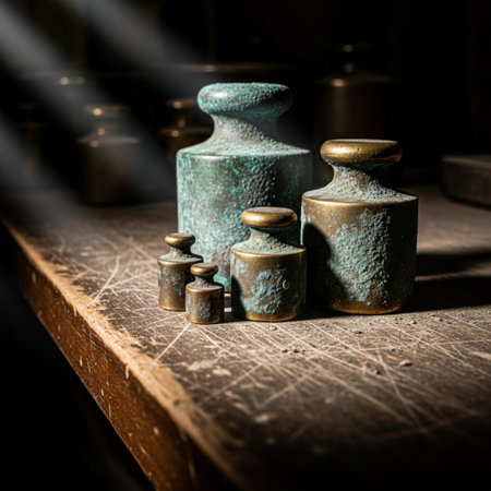 Antique bronze weights for scales on white background. Kitchen decor, food photography props.