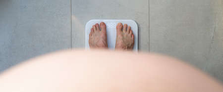 Obese man standing barefoot on a bathroom scale - view from above a prominent belly