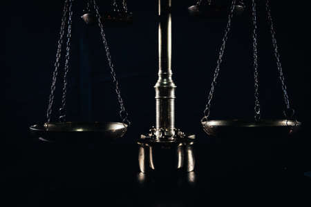 old fashioned retro metallized heavy antique iron balance scales tool for measuring weight with decorative steel design on wooden or wood table