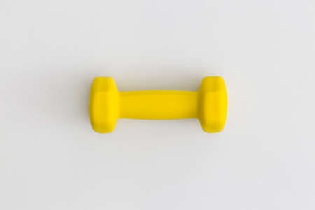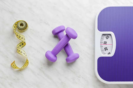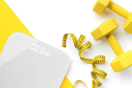 Flat lay top view scales, dumbbell and tape measure on white yellow background