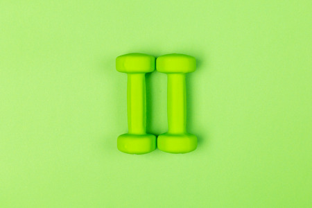 blue, green, two, dumbbells, yellow background, flat lay, still life