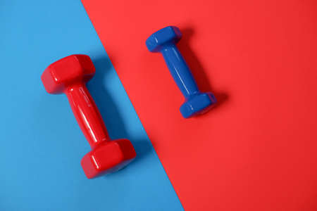 Red and blue dumbbells on an inverted diagonal background. High Angle View Of Dumbbells