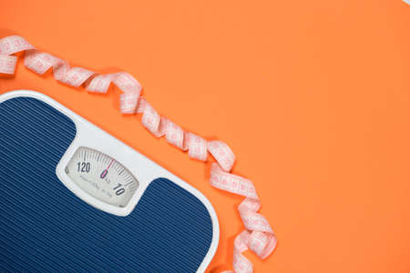 Floor blue scales and centimeter measuring tape on an orange background, top view. The concept of weight loss and weight control