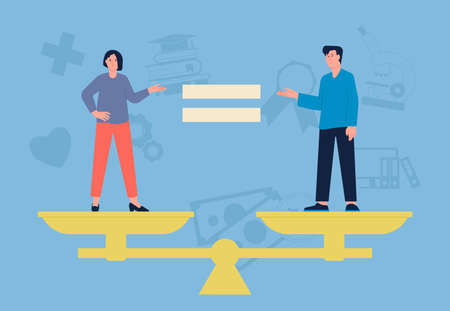 Gender equality. Equilibrium and balancing in business roles between man and woman. Equal and opportunity, male and female on scales, recent vector scene