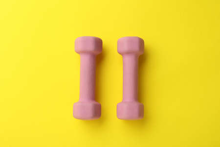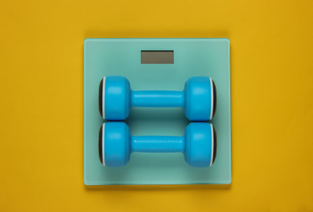 Floor scales and dumbbell on a yellow background. Sport concept, fitness training. Studio shot. Top view