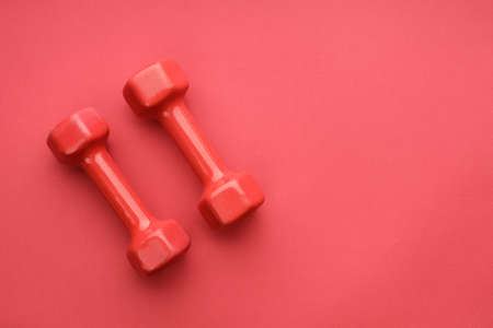 Pair of red 0.5 kg dumbbells on pink paper background.