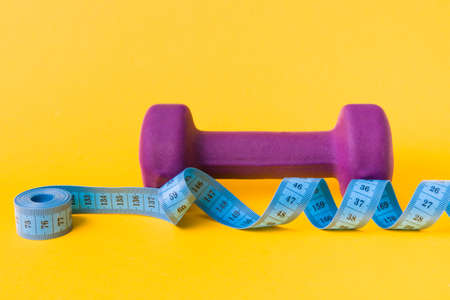 1.5 kilogram purple dumbbell and blue measuring tape on a yellow background, copy space, weight loss concept