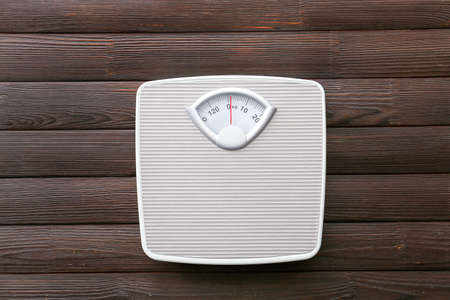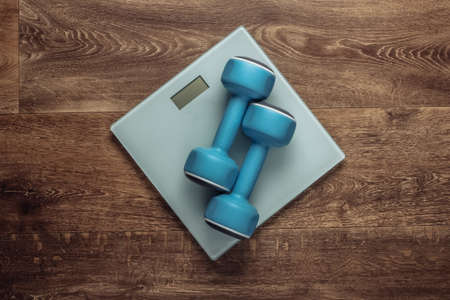 The concept of weight loss, fitness. Floor scales with dumbbells on the floor. Top view