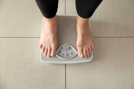 Teenage woman on bathroom scale machine thinking about weight loss and proper body mass. Being fit and healthy concept.