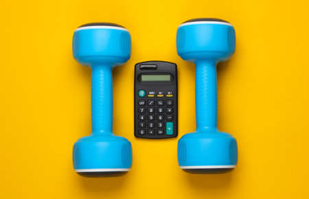 Fitness, sport concept. Calorie Counting. Calculator and dumbbell on a yellow background. Top view