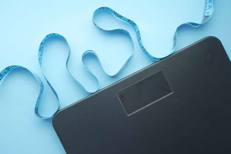 Floor scales and centimeter measuring tape on a blue background, top view. The concept of weight loss and weight control