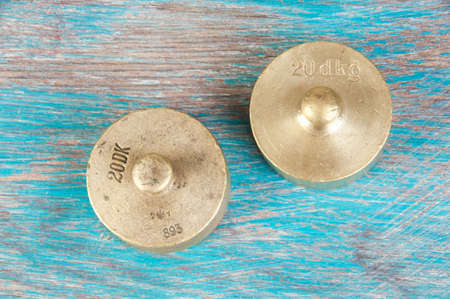 Two antique bronze weights for scales on blue wooden background. Copy space for text and food photography props.
