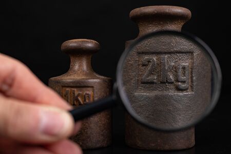 Weights seen through the magnifying glass. Weights for weighing on the table. Dark background.