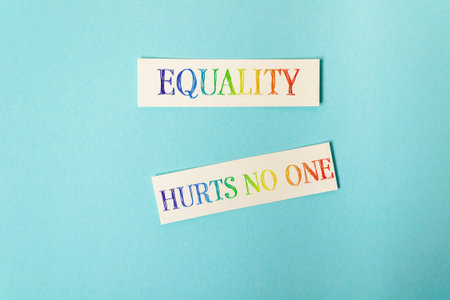 Colorful text displaying equality and hurts no one on a soft blue background, emphasizing a strong message of inclusivity and acceptance in a visually appealing way