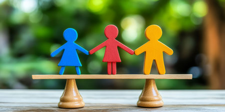 This image depicts colorful wooden figurines alongside brass scales, symbolizing justice and equality. The arrangement highlights community diversity and fairness.