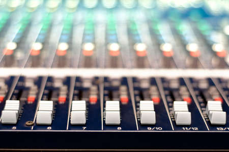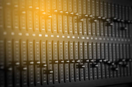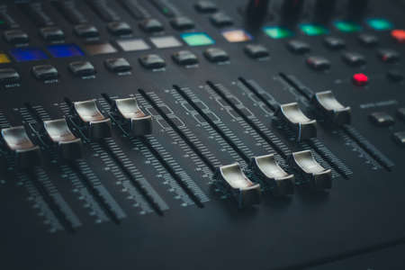 Faders and control buttons on the mixing console. Selective focus