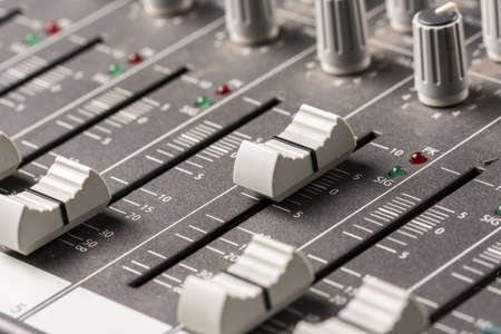 Closeup macro audio mixing console knobs and sliders