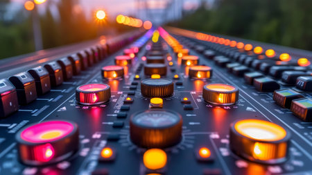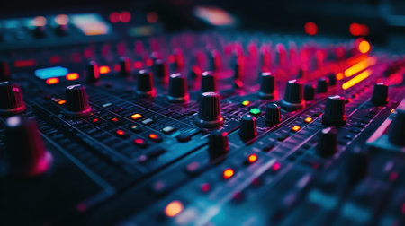 Sound board with vivid lights in the background, ideal for music events and designs with a concert theme.