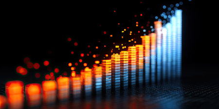 An abstract digital visualization presents a growing bar graph in shades of orange and blue. The composition employs a dark background and selective focus, emphasizing the visual representation of progress. This image could be suitable for use in financial reports, presentations, or various commercial contexts seeking to illustrate trends.