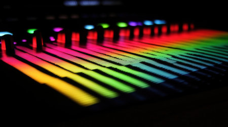 This captivating image showcases a vibrant equalizer display with colorful lighting. It captures the essence of sound levels and audio technology in a dark setting.