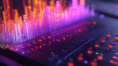 A stunning visual representation of sound with colorful equalizer bars rising and falling over a sleek mixing console, creating an electrifying atmosphere.