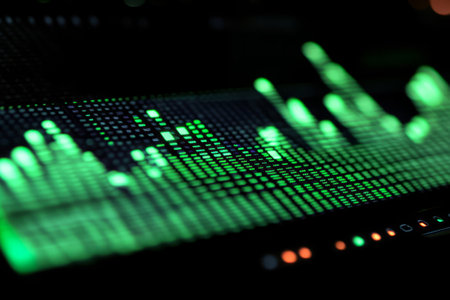 A close-up view of a digital sound mixer highlights green bars indicating audio levels and frequency visualization, showcasing modern sound technology.